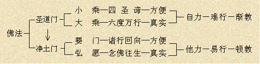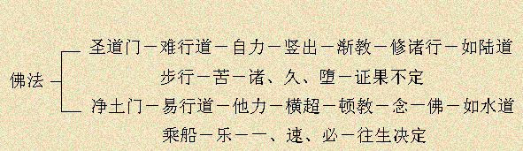 十一、教判圣道门:于娑婆得道,自力断惑出离生死之法门,凡夫难修难证;如陆道步行,苦。 净土门:于极乐得道,他力救度往生净土之法门,凡夫易修易行;如水道乘船,乐。
